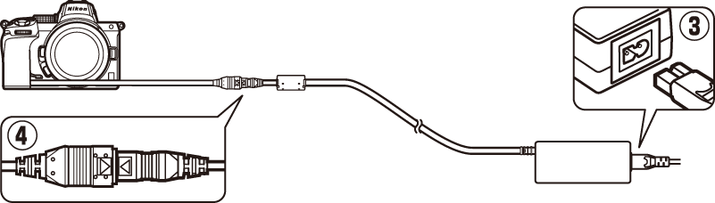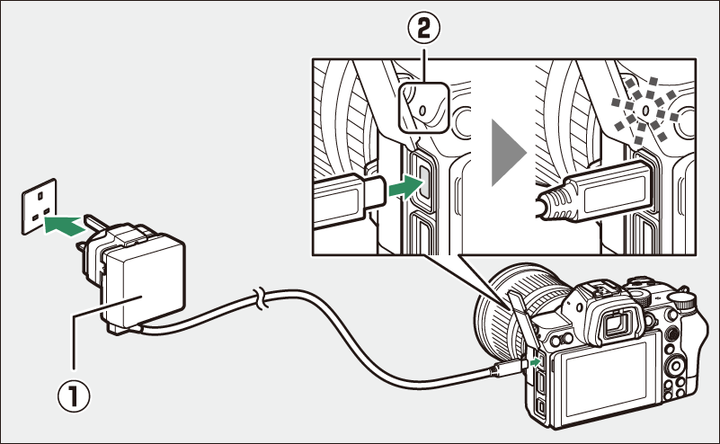 EH‑7P Netzadapter mit Akkuladefunktion : Der EH‑7P kann zum Aufladen von in die Kamera eingesetzten Akkus verwendet werden.