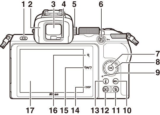 Consulte esta seção para os nomes e localizações dos controles e telas da câmera.