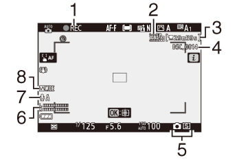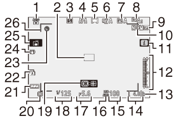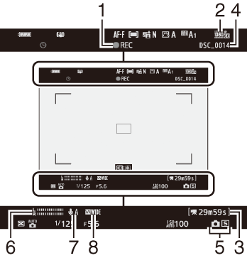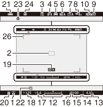 Nas configurações padrão, os seguintes indicadores aparecem no monitor e no visor no modo de foto; para obter uma lista completa de indicadores, consulte “A tela da câmera” ( 0 A tela da câmera ).