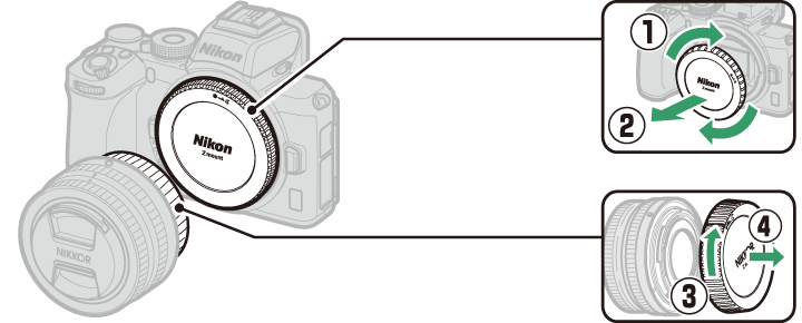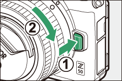 A câmera pode ser usada com lentes de montagem Z. Antes de colocar ou remover lentes, confirme se o botão liga/desliga da câmera está na posição OFF . Tenha cuidado para evitar a entrada de poeira na câmera quando a lente ou a tampa do corpo for removida e certifique-se de remover a tampa da lente antes de tirar fotos. A lente geralmente usada neste manual para fins ilustrativos é uma NIKKOR Z DX 16–50mm f/3.5–6.3 VR.