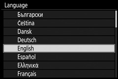 Ao ligar a câmera pela primeira vez, você será solicitado a escolher um idioma usando o seletor múltiplo e o botão J