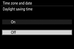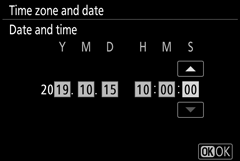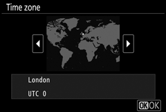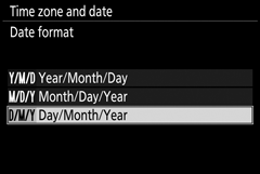 Pressione G e use o seletor múltiplo e o botão J para ajustar o relógio da câmera. Nenhuma outra operação pode ser realizada até que o relógio seja ajustado.