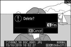 Pressione o botão O Uma caixa de diálogo de confirmação será exibida; pressione o botão O novamente para excluir a imagem e retornar à reprodução. Para sair sem excluir a foto, pressione K .