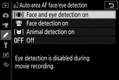 Ao fotografar motivos de retrato com AF de área automática , use a configuração personalizada a2 ( AF de área automática detecção de rosto/olho ) para escolher se a câmera detecta rostos e olhos (AF de detecção de rosto/olho) ou apenas rostos (AF de detecção de rosto ) de temas de retratos humanos.