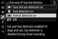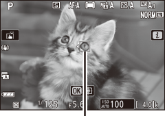 Em modos diferentes de b , a câmera detectará os rostos e olhos de cães e gatos (AF de detecção de animais) quando Detecção de animais ativada for selecionada para a configuração personalizada a2 ( Detecção de rosto/olhos AF de área automática ). A detecção de animais está sempre habilitada no modo f (retrato animal de estimação).