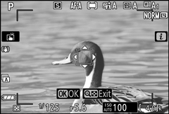 - Posicione o retículo sobre o alvo e pressione J novamente para iniciar o rastreamento; o ponto de foco rastreará o assunto selecionado conforme ele se move pelo quadro. Para encerrar o rastreamento e selecionar o ponto de foco central, pressione J novamente. Observe que se você pressionar o botão de liberação do obturador até a metade para iniciar o rastreamento durante a fotografia quando AF-C ou AF-A estiver selecionado para o modo de foco, a câmera rastreará o assunto apenas enquanto o botão de liberação do obturador for pressionado até a metade; quando o botão for solto, o rastreamento terminará e o ponto de foco em vigor antes do início do rastreamento será restaurado.