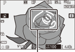 Se o pico de foco estiver ativado usando a configuração personalizada d9 ( destaques de pico ), os objetos que estão em foco serão indicados por contornos coloridos no modo de foco manual. Observe que os destaques de pico podem não ser exibidos se a câmera não conseguir detectar contornos; nesse caso, o foco pode ser verificado usando a visualização através da lente na tela.