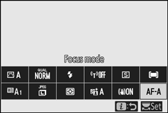 O modo de foco controla como a câmera focaliza. O modo de foco pode ser selecionado usando os itens do modo de foco no menu i e os menus de disparo de foto e filme ( 0 Modo de foco, Modo de foco , Modo de foco ).