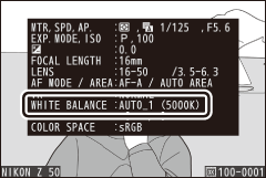 As informações da foto para fotos tiradas usando balanço de branco automático listam a temperatura de cor selecionada pela câmera no momento em que a foto foi tirada. Você pode usar isso como referência ao escolher um valor para Escolher temperatura de cor . Para visualizar os dados de disparo durante a reprodução, vá para Opções de exibição de reprodução no menu de reprodução e selecione Dados de disparo para Informações adicionais da foto .