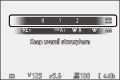 L Manual de predefinição Meça o balanço de branco para o assunto ou fonte de luz (pressione e segure o botão Fn1 para entrar no modo de medição direta, 0 Predefinição Manual ), copie o balanço de branco de uma fotografia existente ou escolha o valor existente segurando o botão Fn1 e girando o disco de subcomando.