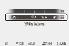 Quando 4 ( Auto ), I ( Fluorescente ), K ( Escolher temperatura de cor ) ou L ( Predefinição manual ) é selecionado, você pode escolher uma subopção segurando o botão Fn1 e girando o disco de subcomando.
