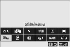 Nas configurações padrão, o equilíbrio de branco também pode ser selecionado segurando o botão Fn1 e girando o disco de comando principal ( 0 Os botões de função ( Fn1 e Fn2 ) ).