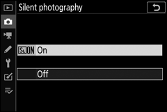 A ativação da fotografia silenciosa altera as taxas de avanço de quadro para os modos de disparo contínuo e desativa alguns recursos, incluindo alta sensibilidade ISO (Alta 1, Alta 2), flash, redução de ruído de longa exposição e redução de cintilação.
