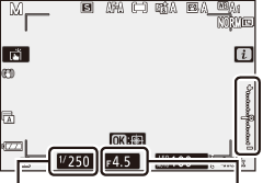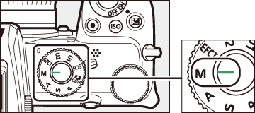 No modo de exposição manual, você controla a velocidade do obturador e a abertura. Gire o disco de comando principal para escolher a velocidade do obturador e o disco de comando secundário para definir a abertura. A velocidade do obturador pode ser definida para valores entre 30 s e 1/4000 s, ou o obturador pode ser mantido aberto indefinidamente por um longo tempo de exposição ( 0 Long Time-Exposições ). A abertura pode ser definida para valores entre os valores mínimo e máximo para a lente. Use os indicadores de exposição para verificar a exposição.