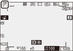 Nesse modo, a câmera ajusta automaticamente a velocidade do obturador e a abertura de acordo com um programa integrado para garantir a exposição ideal na maioria das situações. Diferentes combinações de velocidade do obturador e abertura que produzem a mesma exposição podem ser selecionadas girando o disco de comando principal (“programa flexível”). Enquanto o programa flexível está em vigor, um indicador de programa flexível ( U ) é exibido. Para restaurar as configurações padrão de velocidade do obturador e abertura, gire o disco de comando principal até que o indicador não seja mais exibido, escolha outro modo ou desligue a câmera.