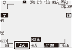 Em automático com prioridade ao obturador, você escolhe a velocidade do obturador enquanto a câmera seleciona automaticamente a abertura que produzirá a exposição ideal. Para escolher uma velocidade do obturador, gire o disco de comando principal. A velocidade do obturador pode ser ajustada para valores entre 30 s e 1/4000 s.