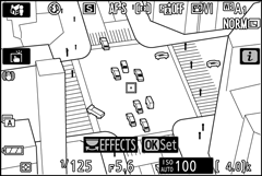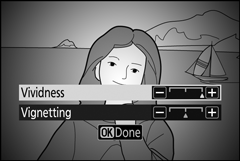 Crie fotos e filmes com saturação e iluminação periférica semelhantes às fotos tiradas com uma câmera de brinquedo. Pressione J para ajustar as configurações ( 0 Ajustar 5 (Efeito de câmera de brinquedo) Configurações ).