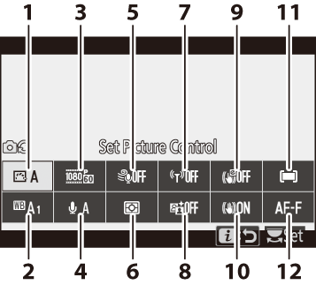 Se Igual às configurações da foto for selecionado para Definir controle de imagem , Equilíbrio de branco , D-Lighting ativo ou VR óptico no menu de gravação de filme, um ícone h aparecerá no canto superior esquerdo do menu i , indicando que as opções selecionadas para essas configurações no modo de foto também se aplicam no modo de filme e vice-versa.
