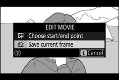 Pressione o botão i para exibir o menu i , depois realce Salvar quadro atual e pressione J para criar uma cópia JPEG do quadro atual. A imagem será gravada nas dimensões selecionadas para Tamanho do quadro/taxa de quadros no menu de gravação de filme.