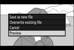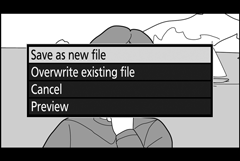 Realce Salvar como novo arquivo e pressione J para salvar a cópia em um novo arquivo. Para substituir o arquivo de filme original pela cópia editada, realce Substituir arquivo existente e pressione J .