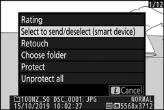 - Selecione para enviar/desmarcar (dispositivo inteligente) : Exibido quando a câmera está conectada a um dispositivo inteligente via Bluetooth integrado usando o item Conectar ao dispositivo inteligente no menu de configuração ( 0 Conectar ao dispositivo inteligente ).