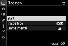 Para iniciar a apresentação de slides, realce Iniciar e pressione J . As seguintes operações podem ser executadas enquanto o show está em andamento: