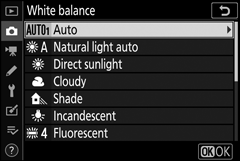 Vá para Balanço de branco no menu de disparo de fotos, realce uma opção de balanço de branco e pressione 2 .