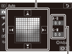 Pressione J para salvar as configurações e retornar ao menu de disparo de fotos. Se um valor diferente de zero for selecionado para o eixo G reen– M agenta, um asterisco (“ U ”) aparecerá próximo ao ícone de balanço de branco na tela de disparo.