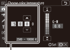 Vá para Equilíbrio de branco no menu de fotografia, realce Escolher temperatura de cor e pressione 2 .