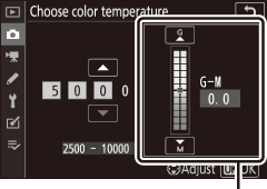 O ajuste fino está disponível através dos menus da câmera. Para obter mais informações sobre ajuste fino, consulte “Ajuste fino do equilíbrio de brancos” ( 0 Ajuste fino do equilíbrio de brancos ). Para obter informações sobre o ajuste fino do balanço de branco manual predefinido, consulte “Ajuste fino do balanço de branco predefinido” ( 0 Ajuste fino do balanço de branco predefinido ).