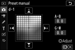 A predefinição atual pode ser ajustada selecionando Ajuste fino no menu de balanço de branco manual predefinido e ajustando o balanço de branco conforme descrito em “Menu de balanço de branco: ajuste fino” ( 0 Menu de balanço de branco: ajuste fino ).