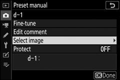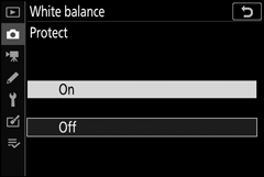 Para proteger a predefinição de balanço de branco atual, selecione Proteger no menu de balanço de branco manual predefinido e, em seguida, realce Ligado e pressione J . As predefinições protegidas não podem ser modificadas e as opções Ajuste fino e Editar comentário não podem ser usadas.