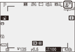 Pressione J para salvar as configurações e retornar ao menu de disparo de fotos. Se o equilíbrio de branco tiver sido ajustado com precisão, um asterisco (“ U ”) aparecerá ao lado do ícone de equilíbrio de branco na tela de disparo.