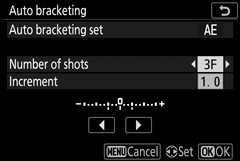 Realce Incremento e pressione 4 ou 2 para escolher o incremento de bracketing. Quando 1/3 passo é selecionado para a configuração personalizada b1 ( etapas EV para controle de exposição ), o tamanho do incremento pode ser escolhido entre 0,3 (1/3), 0,7 (2/3), 1, 2 e 3 EV. Os programas de bracketing com um incremento de 0,3 (1/3) EV estão listados abaixo.