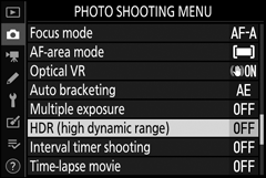 Destaque HDR (alta faixa dinâmica) no menu de disparo de fotos e pressione 2 .
