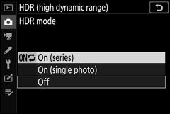 - Para tirar uma série de fotografias HDR , selecione 0 Ligado (série) . O disparo HDR continuará até que você selecione Desligado para o modo HDR .