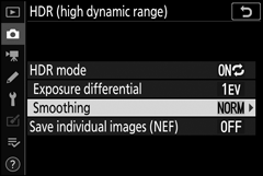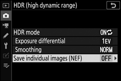 Para escolher se deseja salvar as imagens individuais NEF (RAW) que compõem a fotografia HDR, realce Salvar imagens individuais (NEF) e pressione 2 , depois pressione 1 ou 3 para escolher a opção desejada e pressione J para selecionar.