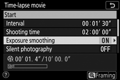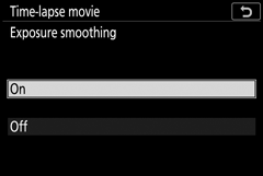 - Suavização da exposição : Selecionar Ligado suaviza as mudanças abruptas na exposição em modos diferentes de M (observe que a suavização da exposição só tem efeito no modo M se o controle automático de sensibilidade ISO estiver ativado). Grandes alterações no brilho do assunto durante o disparo podem resultar em variações aparentes na exposição, caso em que pode ser necessário encurtar o intervalo entre os disparos.
