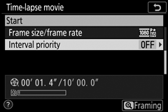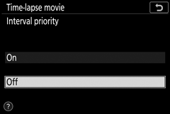 - Prioridade de intervalo : Selecione Ligado para garantir que os quadros fotografados nos modos P e A sejam tirados no intervalo escolhido, Desligado para garantir que as fotos sejam expostas corretamente. Se Ligado estiver selecionado, escolha um modo de foco de MF ou AF-C e verifique se a velocidade mínima do obturador escolhida para configurações de sensibilidade ISO > Controle automático de sensibilidade ISO no menu de disparo de fotos é mais rápida que o intervalo. Se AF-C for selecionado para o modo de foco, verifique se Release é escolhido para a configuração personalizada a1( seleção de prioridade AF-C ).