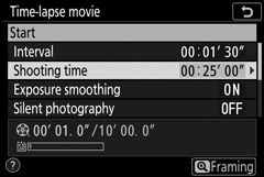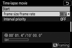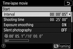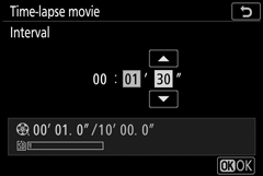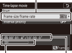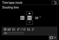 O número total de quadros no filme final pode ser calculado dividindo o tempo de disparo pelo intervalo, arredondando para cima e adicionando 1. A duração do filme final pode ser calculada dividindo o número de disparos pela taxa de quadros selecionada para Tamanho do quadro/taxa de quadros . Um filme de 48 quadros gravado em 1920 × 1080; 24p, por exemplo, terá cerca de dois segundos de duração. A duração máxima para filmes com lapso de tempo é de 20 minutos.