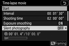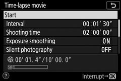 Antes de gravar um filme de lapso de tempo, selecione Fuso horário e data no menu de configuração e certifique-se de que o relógio da câmera esteja ajustado para a hora e data corretas e, em seguida, faça uma foto de teste nas configurações atuais e veja os resultados. Os filmes de lapso de tempo são gravados usando o recorte de filme; para verificar a composição, toque no botão X na exibição de filme de lapso de tempo (para retornar à exibição de filme de lapso de tempo , toque no botão W ). Para obter uma coloração consistente, escolha uma configuração de balanço de branco diferente de 4 (automático) ou D (automático de luz natural).