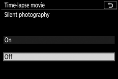 Para encerrar o disparo antes que todas as fotos sejam tiradas, pressione J entre os disparos. Você também tem a opção de pressionar o botão G para exibir o menu de filme de lapso de tempo , destacando Desligado e pressionando J . Se, no entanto, o tempo selecionado para Intervalo for muito curto, pressionar J entre os disparos pode não surtir efeito ou o menu de filme de lapso de tempo pode não ser exibido quando o botão G for pressionado; nesse caso, você precisará desligar a câmera .
