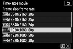 A seleção de Filme com lapso de tempo exibe as opções abaixo.