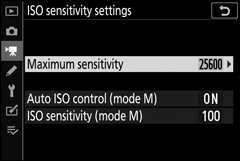 - Sensibilidade máxima : Escolha o limite superior para o controle automático de sensibilidade ISO a partir de valores entre ISO 200 e 25600. O controle automático de sensibilidade ISO é usado nos modos P , S e A e quando Ligado é selecionado para Controle automático de ISO (modo M) no modo M .