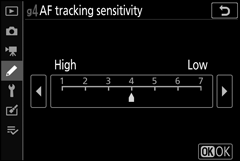 Escolha a rapidez com que o foco responde quando o assunto sai do ponto de foco ou algo passa entre o assunto e a câmera no modo de filme. Escolha entre os valores entre 7 (Baixo) e 1 (Alto) . Quanto maior o valor, mais lenta será a resposta e menor será a probabilidade de você perder o foco no assunto original quando algo passar entre o assunto e a câmera. Quanto menor o valor, mais rápido a câmera responde ao assunto que sai da área de foco, mudando o foco para um novo assunto na mesma área.