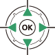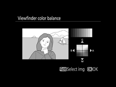 • O equilíbrio de cores do visor é ajustado usando o seletor múltiplo. Pressione 1 , 3 , 4 e 2 para ajustar o equilíbrio de cores conforme mostrado abaixo. Pressione J para sair quando os ajustes estiverem completos.