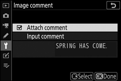 • Anexar comentário : Selecione esta opção para anexar o comentário a todas as fotografias subsequentes. Destaque Anexar comentário e pressione 2 para ativá-lo ou desativá-lo. Após escolher a configuração desejada, pressione J para sair.