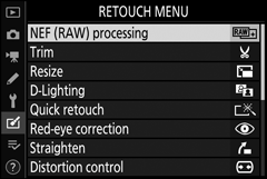 Destaque Processamento NEF (RAW) no menu de retoque e pressione 2 .
