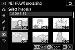 Se você escolher Selecionar imagem(ns) na Etapa 2, uma caixa de diálogo de seleção de imagem será exibida listando apenas imagens NEF (RAW) criadas com esta câmera. Realce imagens usando o seletor múltiplo e toque no botão W para selecionar ou desmarcar; as imagens selecionadas são indicadas por um ícone L Para visualizar a imagem realçada em tela cheia, toque e segure o botão X Pressione J para prosseguir para a Etapa 4 quando sua seleção estiver concluída.