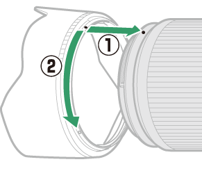 Alinhe a marca de montagem do parassol da lente com a marca de alinhamento do parassol da lente ( q ) e gire o parassol ( w ) até que a marca de montagem esteja alinhada com a marca de trava do parassol da lente ( e ).